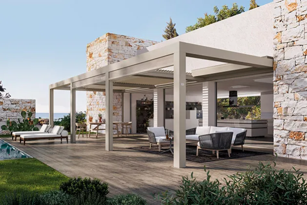 Un pergolato bioclimatico chiuso e addossato alla facciata può contribuire anche al benessere degli ambienti interni. In inverno crea una camera termica che riduce le dispersioni e migliora il comfort vicino alle grandi vetrate; in estate funziona come filtro solare, limitando il surriscaldamento degli ambienti e migliorando l’efficienza energetica dell’abitazione. È uno dei motivi per cui le pergole bioclimatiche vengono considerate vere e proprie microarchitetture, capaci di dialogare con la casa sia dal punto di vista estetico sia da quello funzionale.